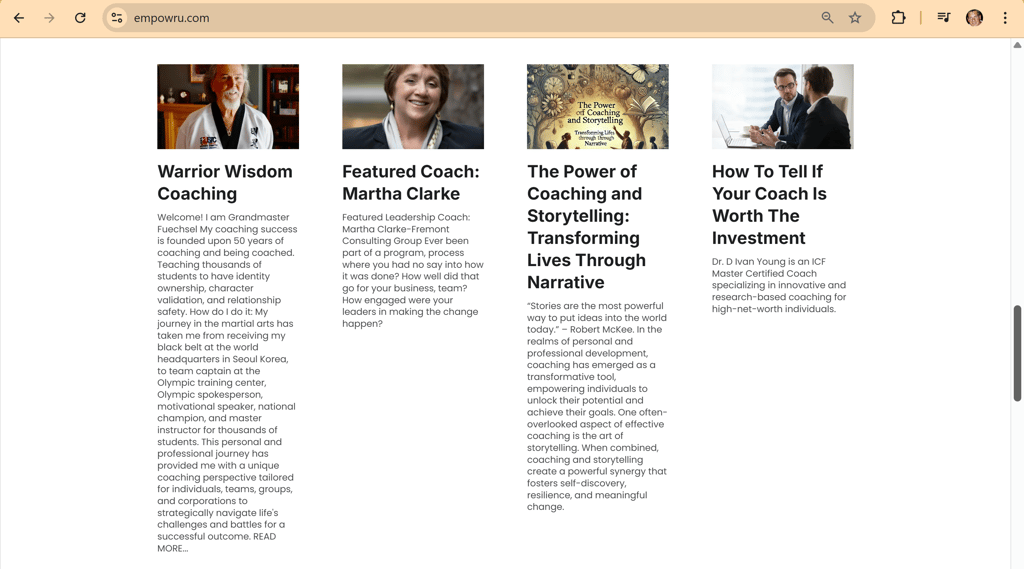 2. Empowr U generated coaching profile page with links to your YouTube channel, coaching course offerings, blogs and articles, directory listings, discovery call sign-up, Empowr U contact form with incoming leads coming directly to you.