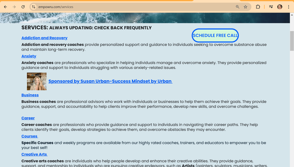 1. Empowr U generated coaching profile page with links to your YouTube channel, coaching course offerings, blogs and articles, directory listings, discovery call sign-up, Empowr U contact form with incoming leads coming directly to you.